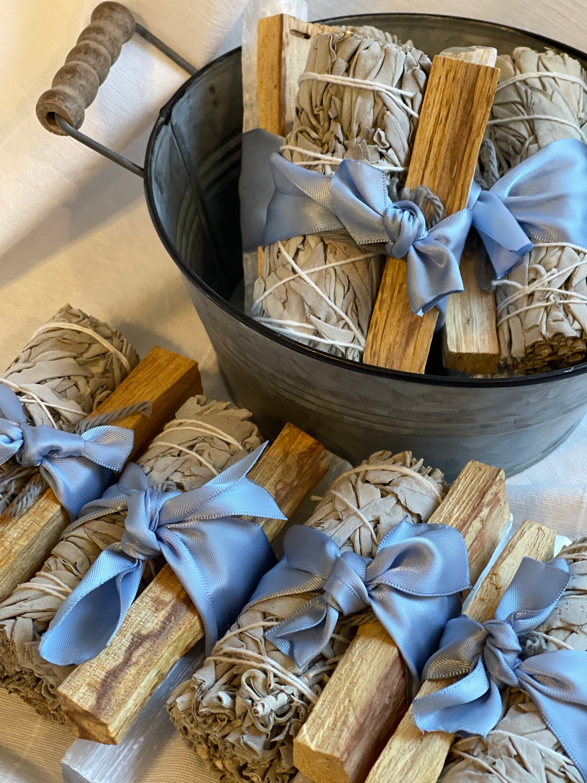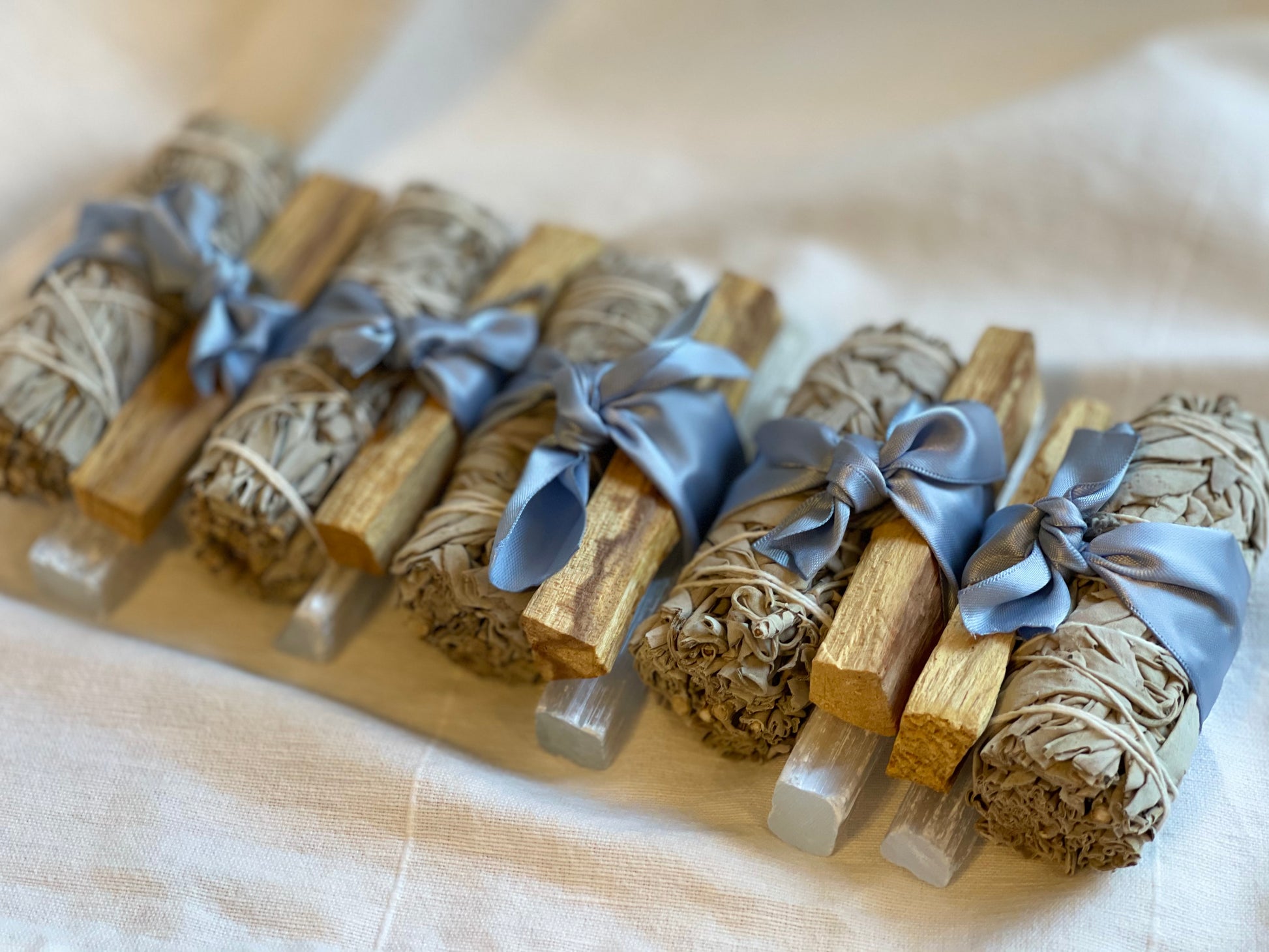 Each kit comes with a 4in White sage bundle, a Peruvian Palo santo stick and a 5 in” selenite wand.