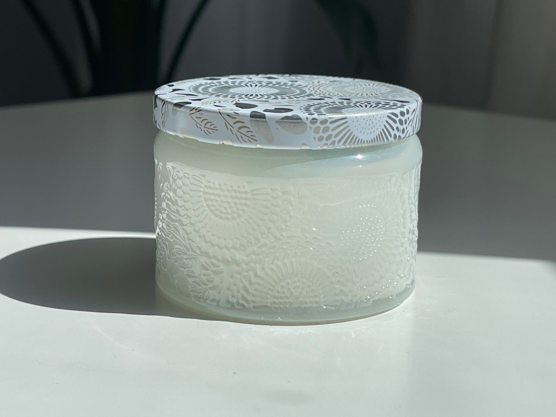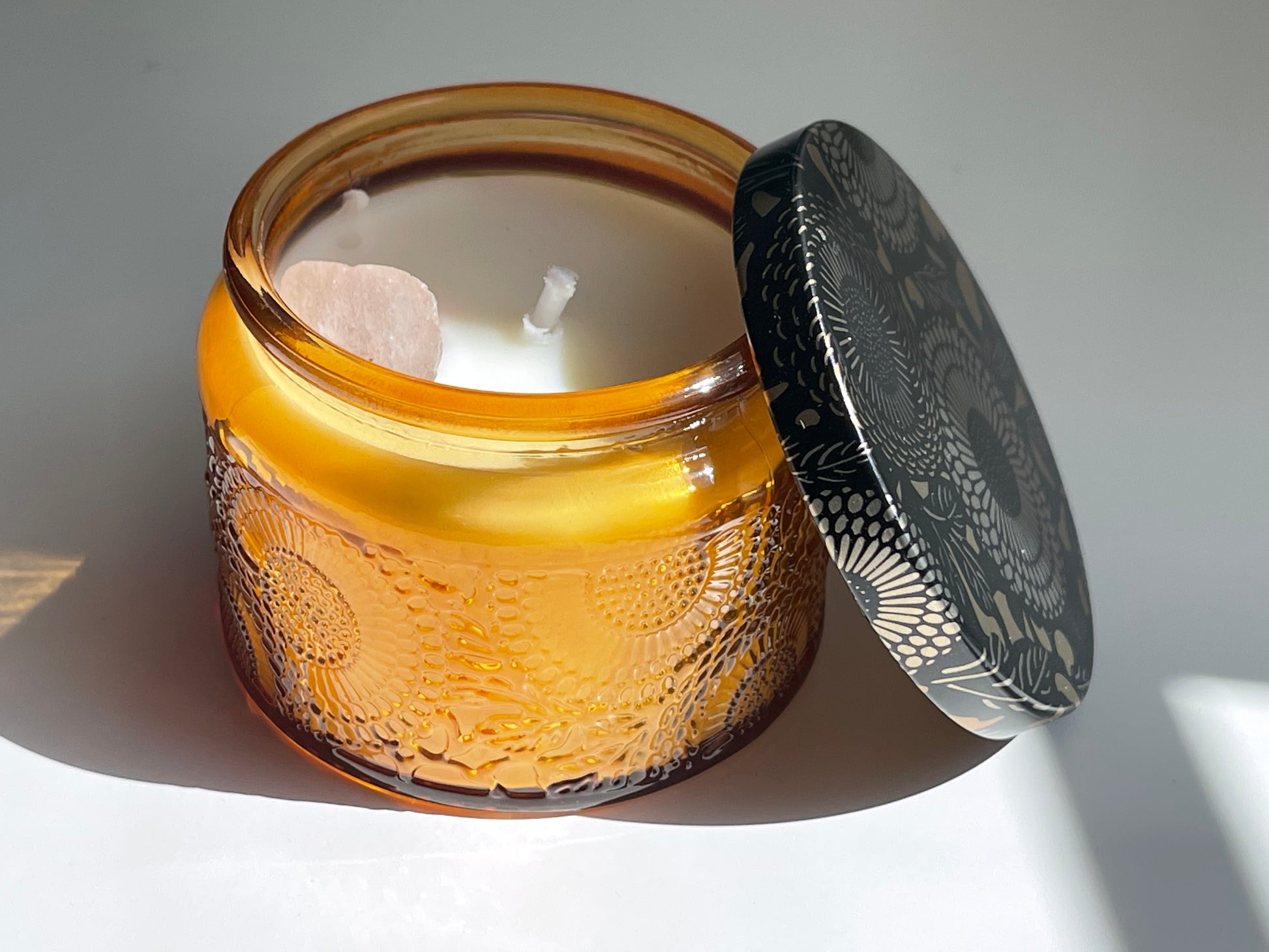 CAUTION: Remove crystal before lighting. Place candle on a heat resistance surface only. Trim wick to 8mm before every lighting. Burn no more than two hours each time. Remove all match and wick debris before lighting.