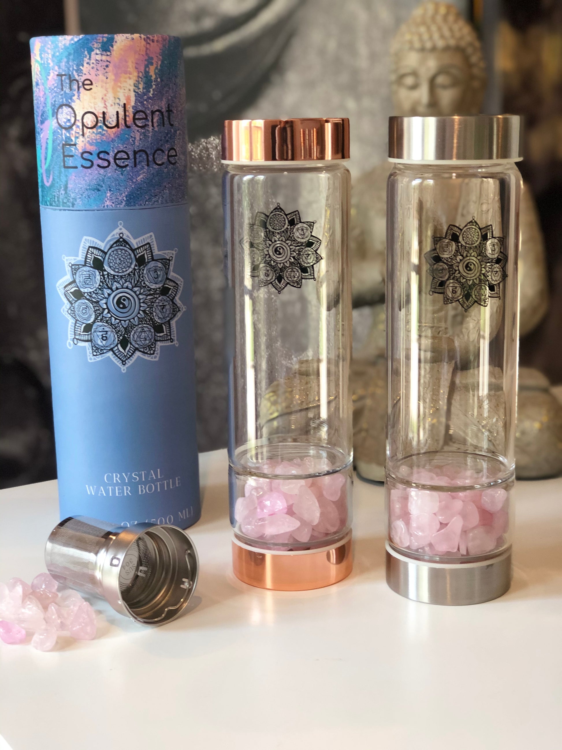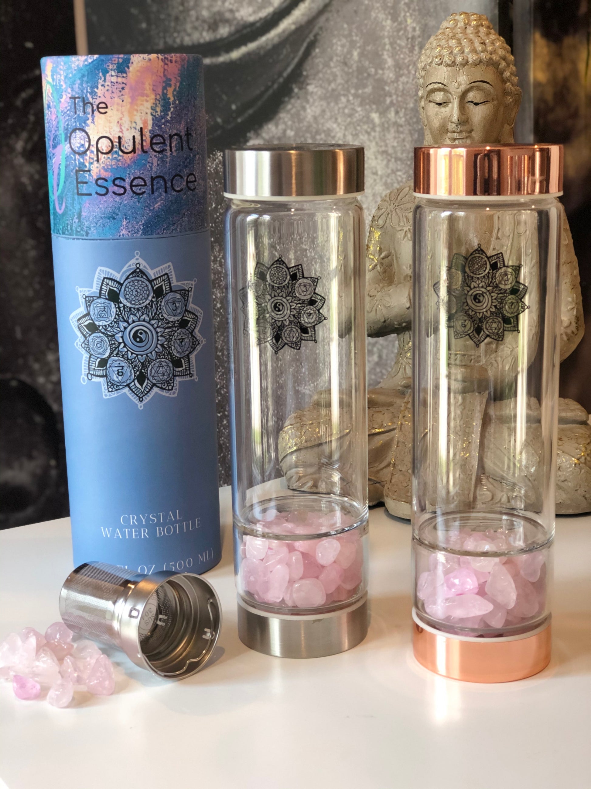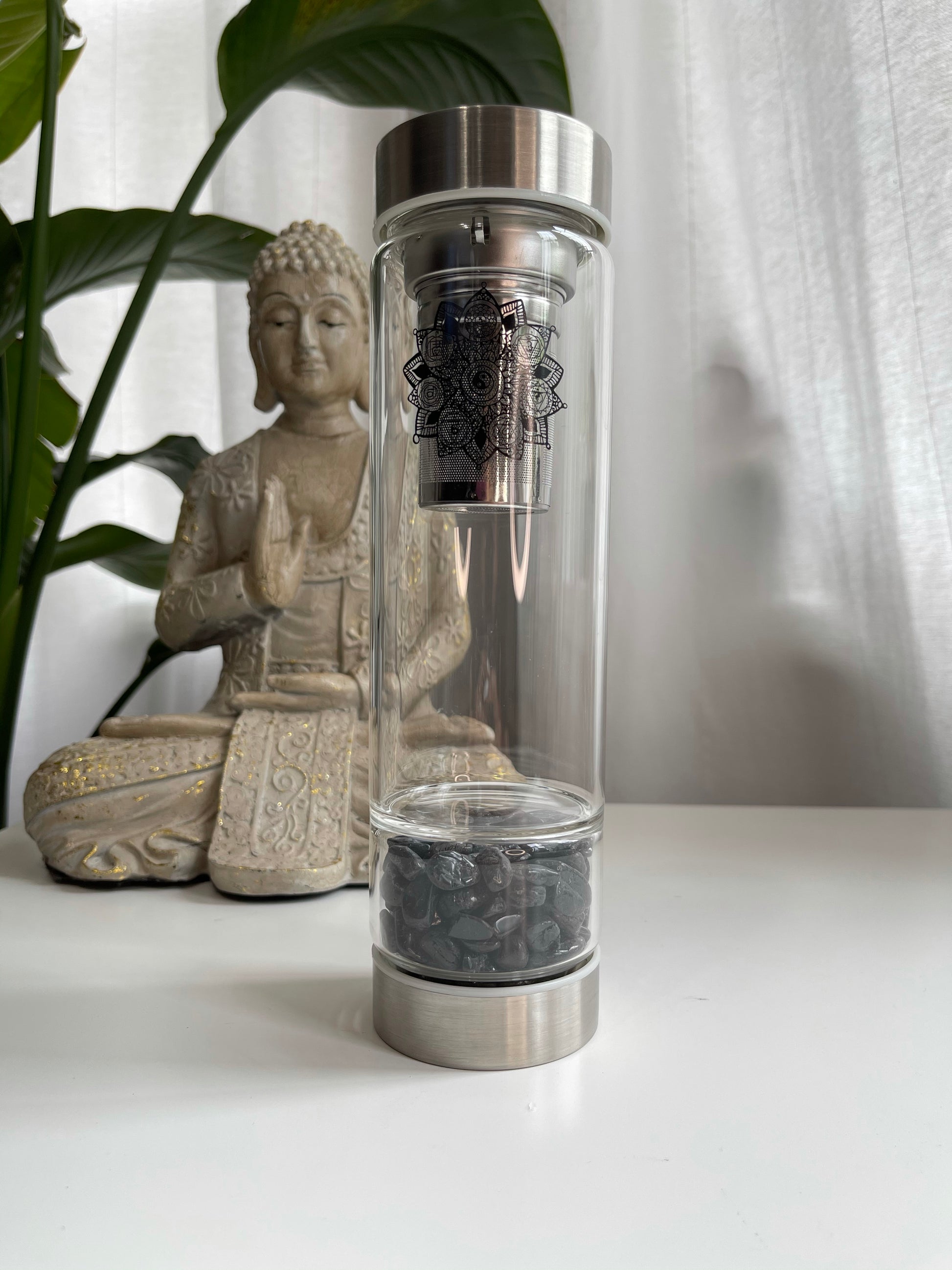 Each bottle contains 100% natural polished Gemstones and holds a capacity of 500ml of water. Our bottles are FDA approved and BPA free made from high quality high borosilicate glass. High borosilicate glass is environmentally friendly, hygienic, durable and thermal shock resistant.
