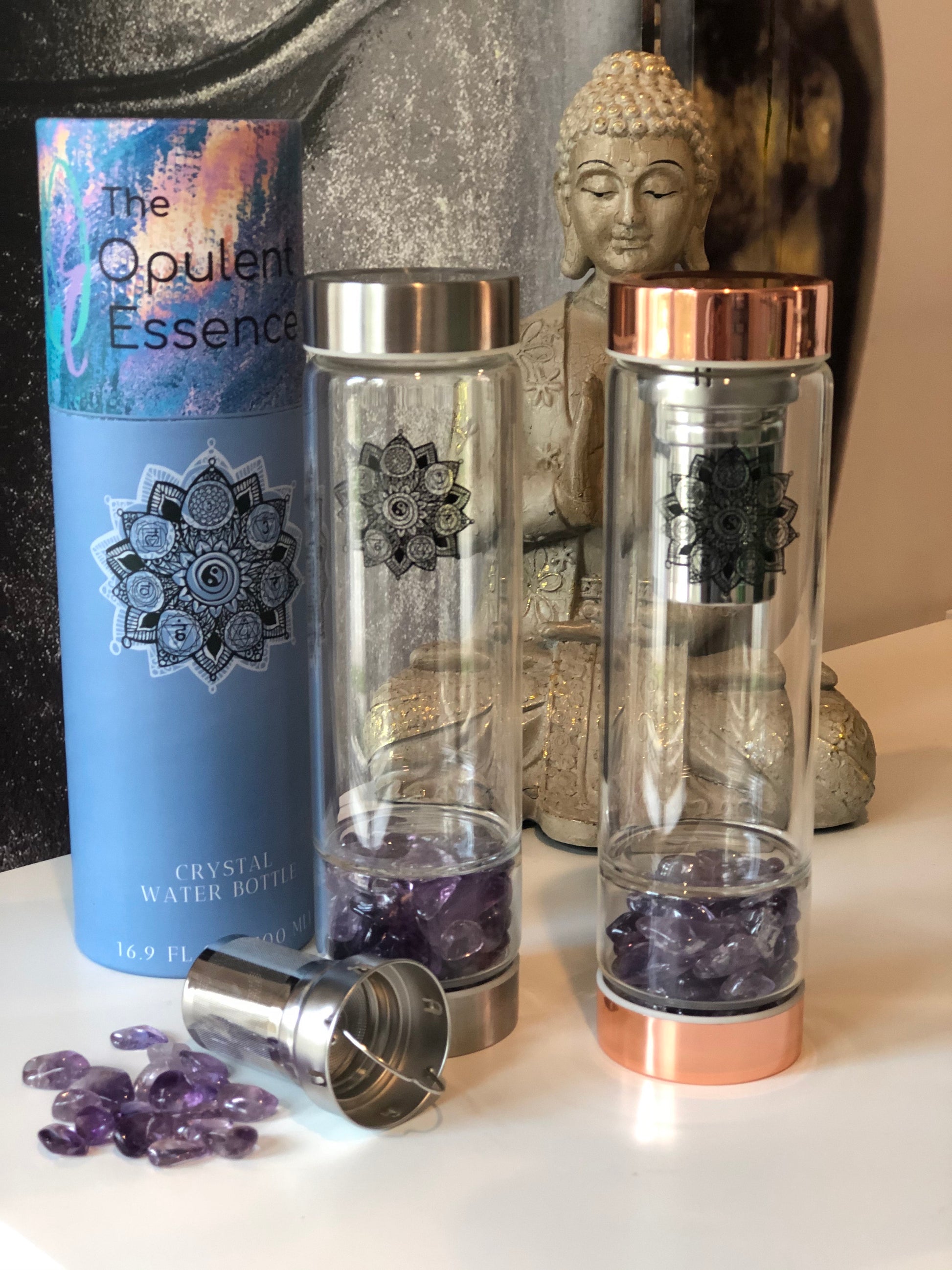 You have the choice to use the gemstone crystals that come with the bottle or crystals of your own. You can easily swap out the crystals at any time to change the energy. For preservation and sanitation of your crystals, the gemstones are placed in a separate crystal chamber for easy swapping and cleansing.